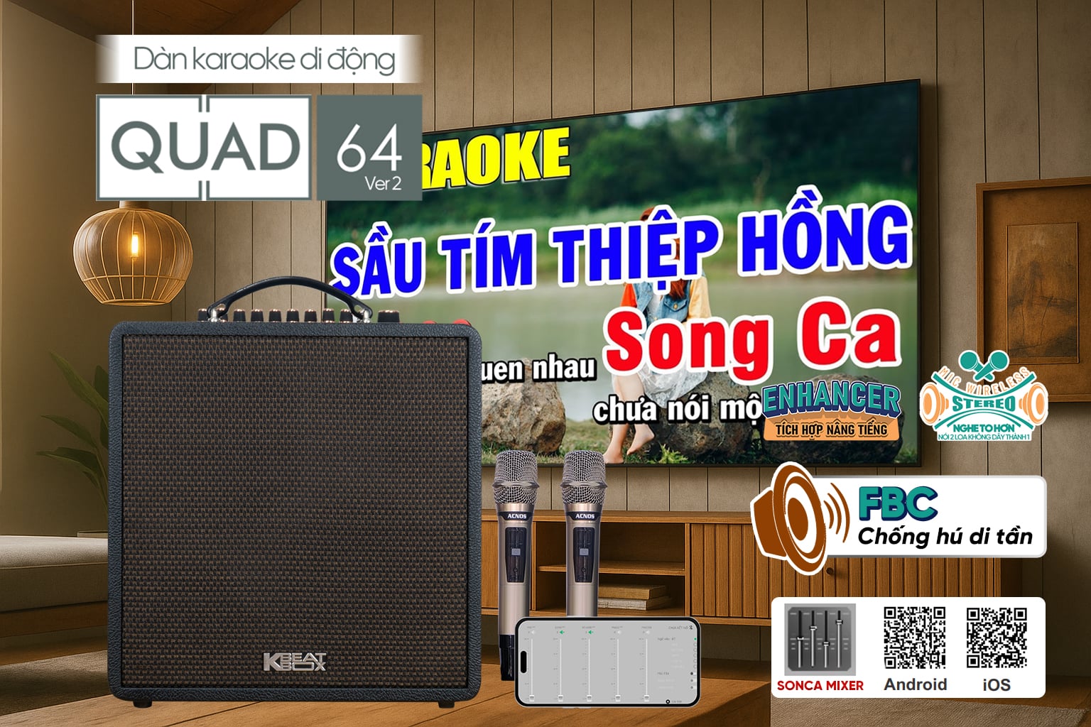 Nâng tiếng ENHANCER - công nghệ cải tiến âm thanh hiện đại, giúp giọng hát và nhạc nền trở nên rõ ràng, sắc nét hơn. Nhờ khả năng tăng cường các dải tần quan trọng, QUAD64 Ver2 mang đến âm thanh trong trẻo, đầy đặn và giàu cảm xúc. Người dùng có thể cảm nhận được sự khác biệt rõ rệt khi nghe nhạc hoặc hát karaoke, đặc biệt ở những bản nhạc giàu chi tiết. Tính năng này còn giúp tối ưu âm thanh theo sở thích, phù hợp với nhiều thể loại nhạc khác nhau.