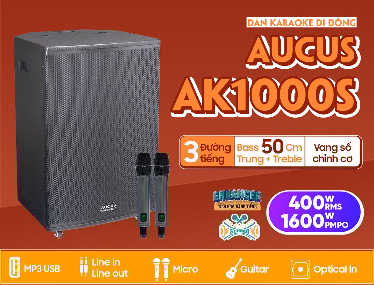 AUCUS AK1000S được trang bị hệ thống loa 3 đường tiếng cho âm thanh trung thực, chi tiết đến từng dải âm phù hợp cho nhiều chất liệu âm nhạc khác nhau. Công suất khủng 400W RMS tương đương với công suất âm thanh 1600W PMPO cùng hệ thống loa bao gồm: loa BASS 50CM (18") + loa TRUNG + loa TREBLE. AUCUS AK1000S là sự kết hợp hoàn hảo, mang đến trải nghiệm âm thanh tuyệt đỉnh cho cả karaoke và nghe nhạc. Với âm bass uy lực mạnh mẽ cùng dải âm trung cao xuất sắc, trong trẻo mọi bài hát đều trở nên sống động và lôi cuốn hơn bao giờ hết.