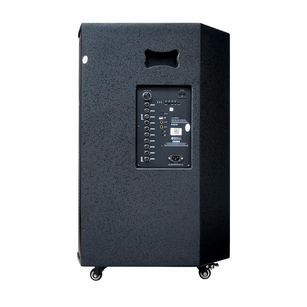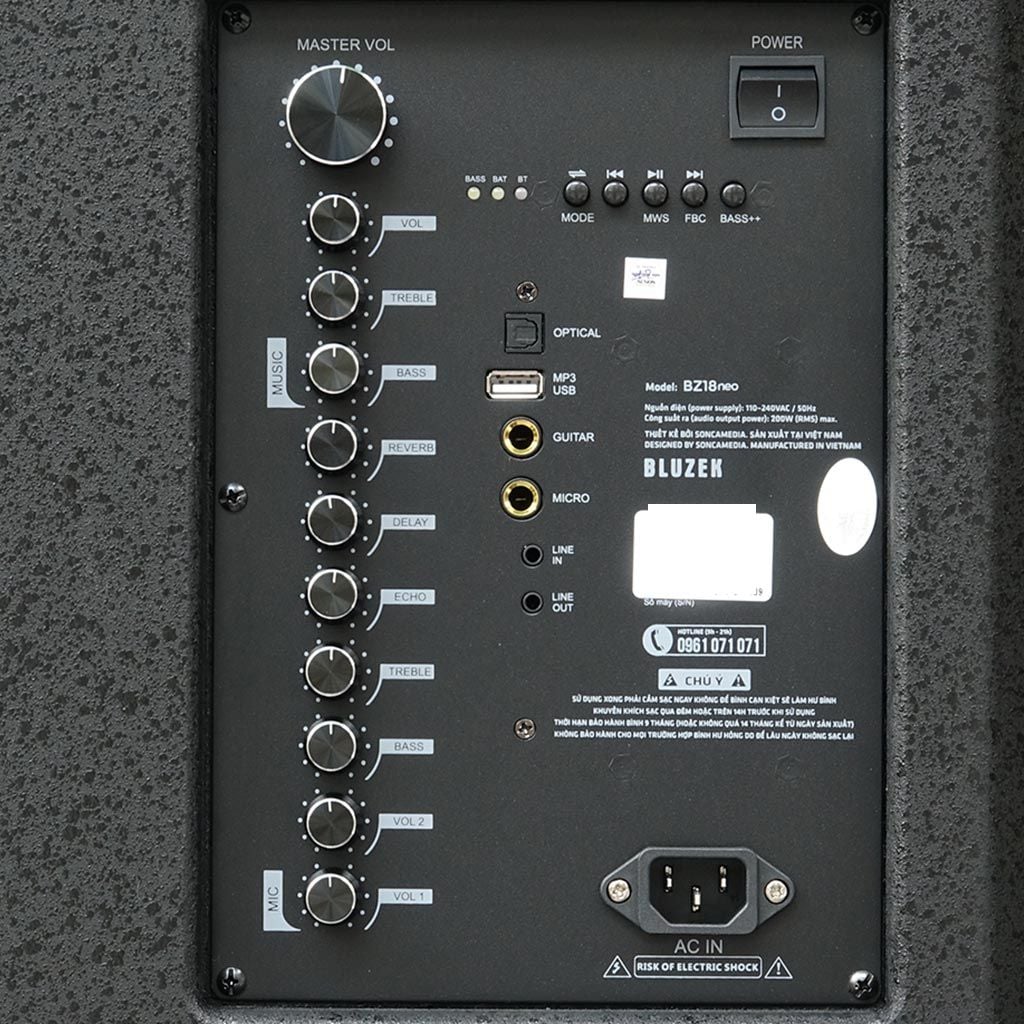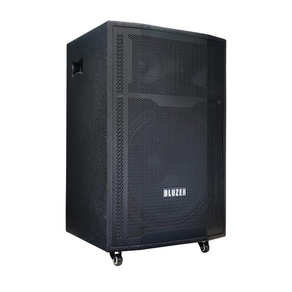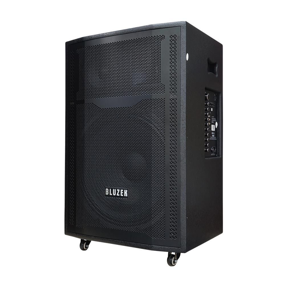 Dàn karaoke di động Bluzek BZ18neo được thiết kế thùng gỗ sơn màu đen, mặt lưới đen gắn kèm bánh xe dễ dàng di chuyển. Hệ thống loa bao gồm 1-loa BASS 50CM (18") + 1 loa TRUNG 16CM (6.5") + loa TREBLE cho âm thanh chân thật, mạnh mẽ, dải âm nghe rõ nét hơn, trầm ấm phù hợp với không gian tiệc trong nhà, sân vườn hoặc các buổi dã ngoại, team building ngoài trời. Loa karaoke Bluzek BZ18neo có công suất RMS 200W tương đương công suất âm thanh PMPO lên đến 850W giúp việc phát nhạc trở nên lâu dài và bền bỉ hơn. Micro nhôm UHF cao cấp không dây nhẹ hơi, nâng giọng hát karaoke trở nên chuyên nghiệp hơn bao giờ hết.