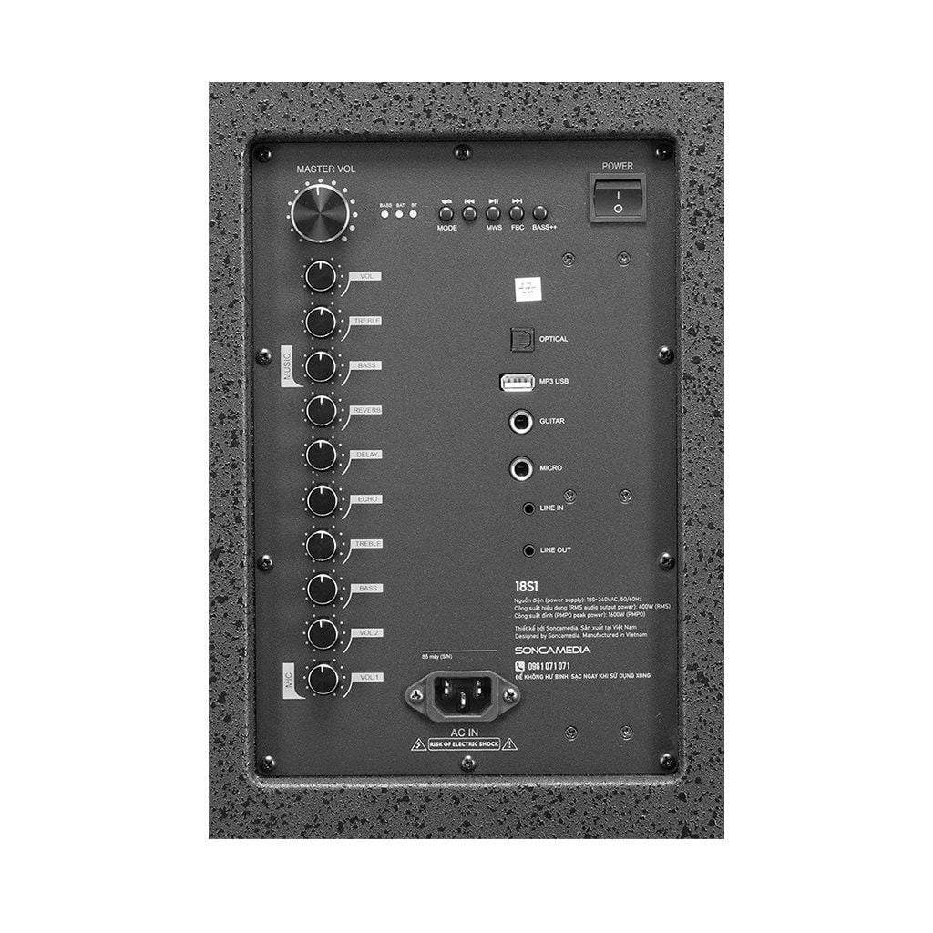 SONCAMEDIA 18S1 được trang bị hệ thống loa 3 đường tiếng cho âm thanh trung thực, chi tiết đến từng dải âm phù hợp cho nhiều chất liệu âm nhạc khác nhau. Công suất khủng 400W RMS tương đương với công suất âm thanh 1600W PMPO cùng hệ thống loa bao gồm: loa BASS 50CM (18") + loa TRUNG + loa TREBLE. Soncamedia 18S1 là sự kết hợp hoàn hảo, mang đến trải nghiệm âm thanh tuyệt đỉnh cho cả karaoke và nghe nhạc. Với âm bass uy lực mạnh mẽ cùng dải âm trung cao xuất sắc, trong trẻo mọi bài hát đều trở nên sống động và lôi cuốn hơn bao giờ hết.