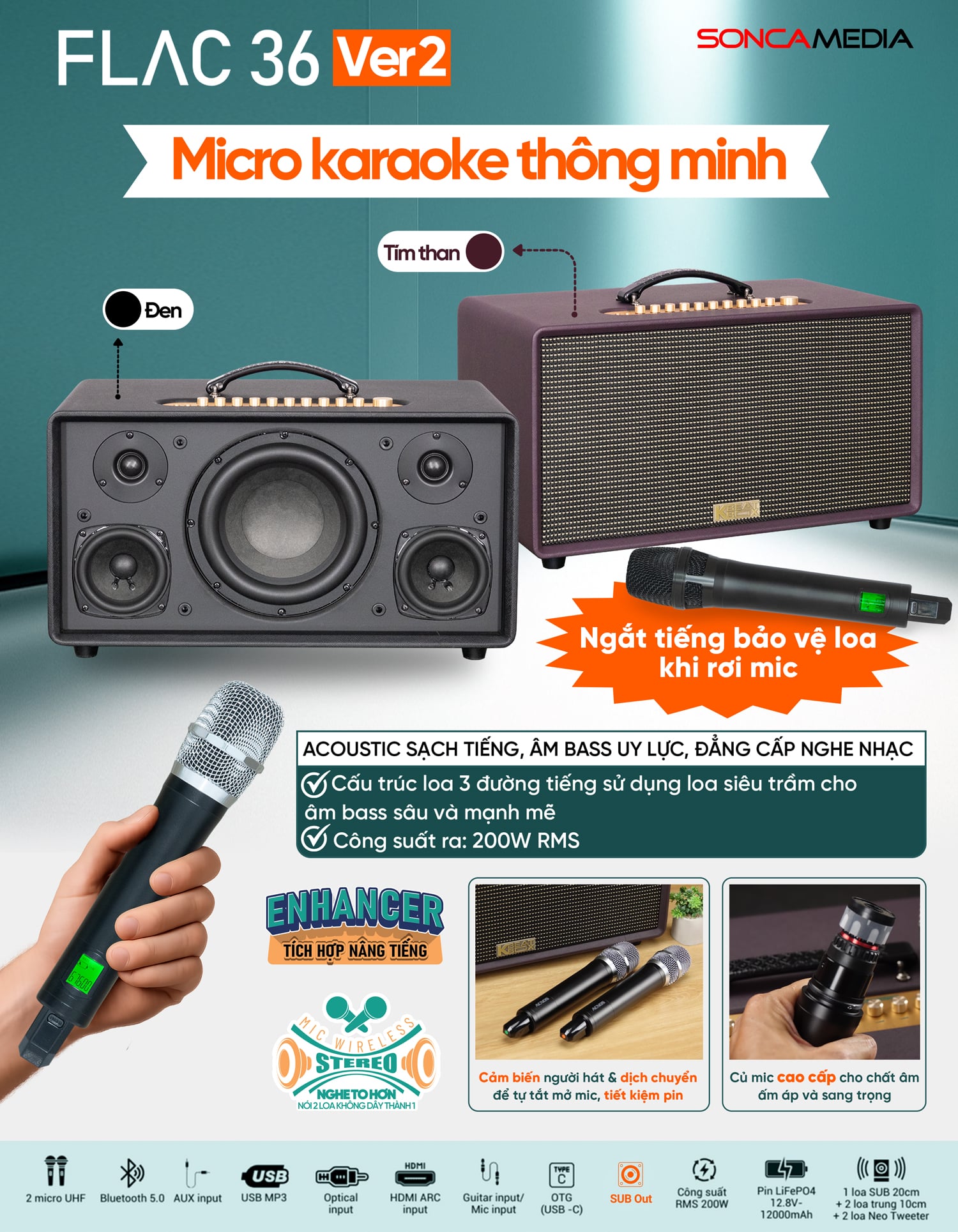 Sau thành công vang dội của phiên bản ACNOS FLAC 36 ra mắt dịp Tết 2024, Soncamedia tiếp tục khẳng định vị thế tiên phong với sự trở lại của FLAC 36 Ver2 – phiên bản năm 2025. Nâng cấp đột phá: Micro thông minh hoàn toàn mới, mang đến trải nghiệm cao cấp và an toàn hơn. FLAC 36 Ver2 sử dụng củ micro mới cho chất âm ấm áp, chi tiết và đầy đặn hơn, phù hợp với cả giọng nam trầm lẫn giọng nữ cao, đem lại cảm giác ca hát mượt mà và chuyên nghiệp. Wireless Microphone tích hợp cảm biến chuyển động, nhận biết người hát thật, tự khóa tiếng khi rơi hay va đập để bảo vệ loa.