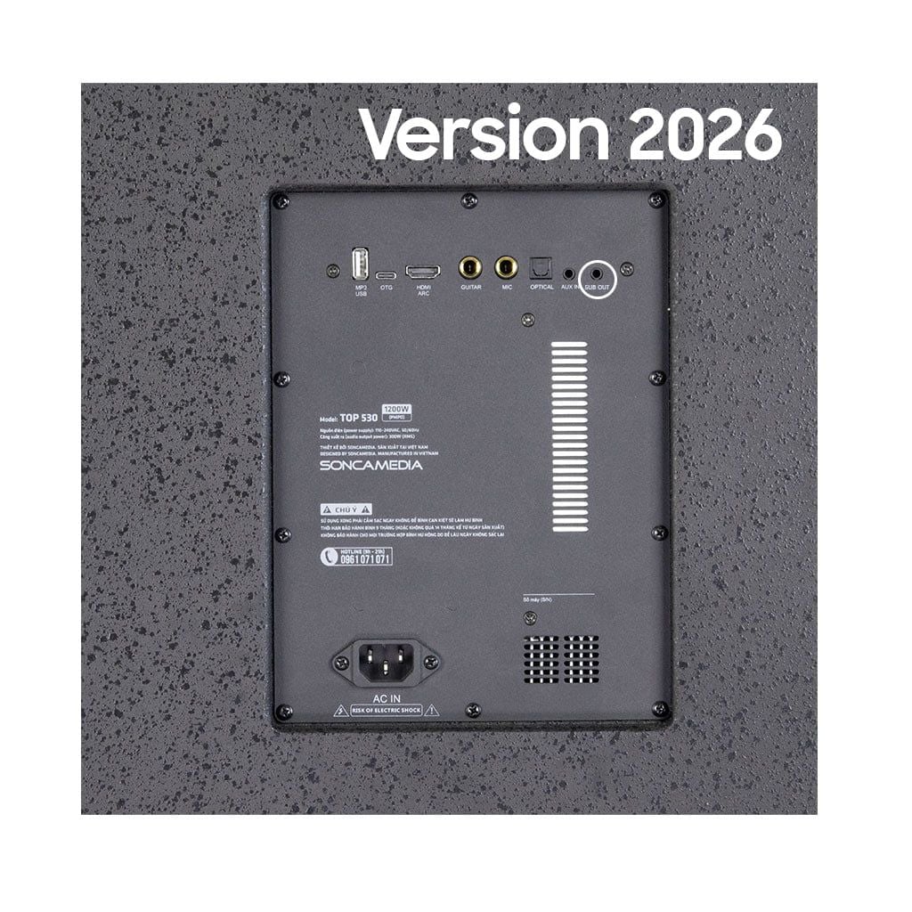 | Cổng kết nối | OTG (USB-C), MP3 USB, HDMI ARC, OPTICAL (IN), AUX IN (jack 3.5mm); GUITAR - MIC (jack 6.35mm) |