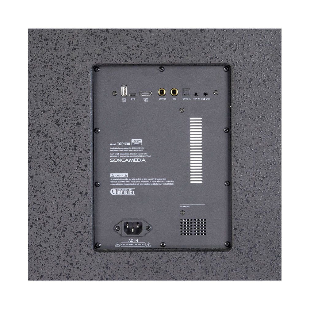 Dàn karaoke di động Soncamedia TOP 530 là dòng loa kéo 5 tấc cao cấp với cấu trúc 2 đường tiếng kết hợp phân tần chủ động bằng DSP. Công suất thực 300W RMS tương đương với công suất âm thanh 1200W PMPO thích hợp cho không gian hội nghị, buổi tiệc gia lớn. Sản phẩm không chỉ nổi bật với vẻ ngoài hiện đại mà còn sở hữu công nghệ âm thanh tiên tiến, mang lại trải nghiệm âm nhạc đỉnh cao.